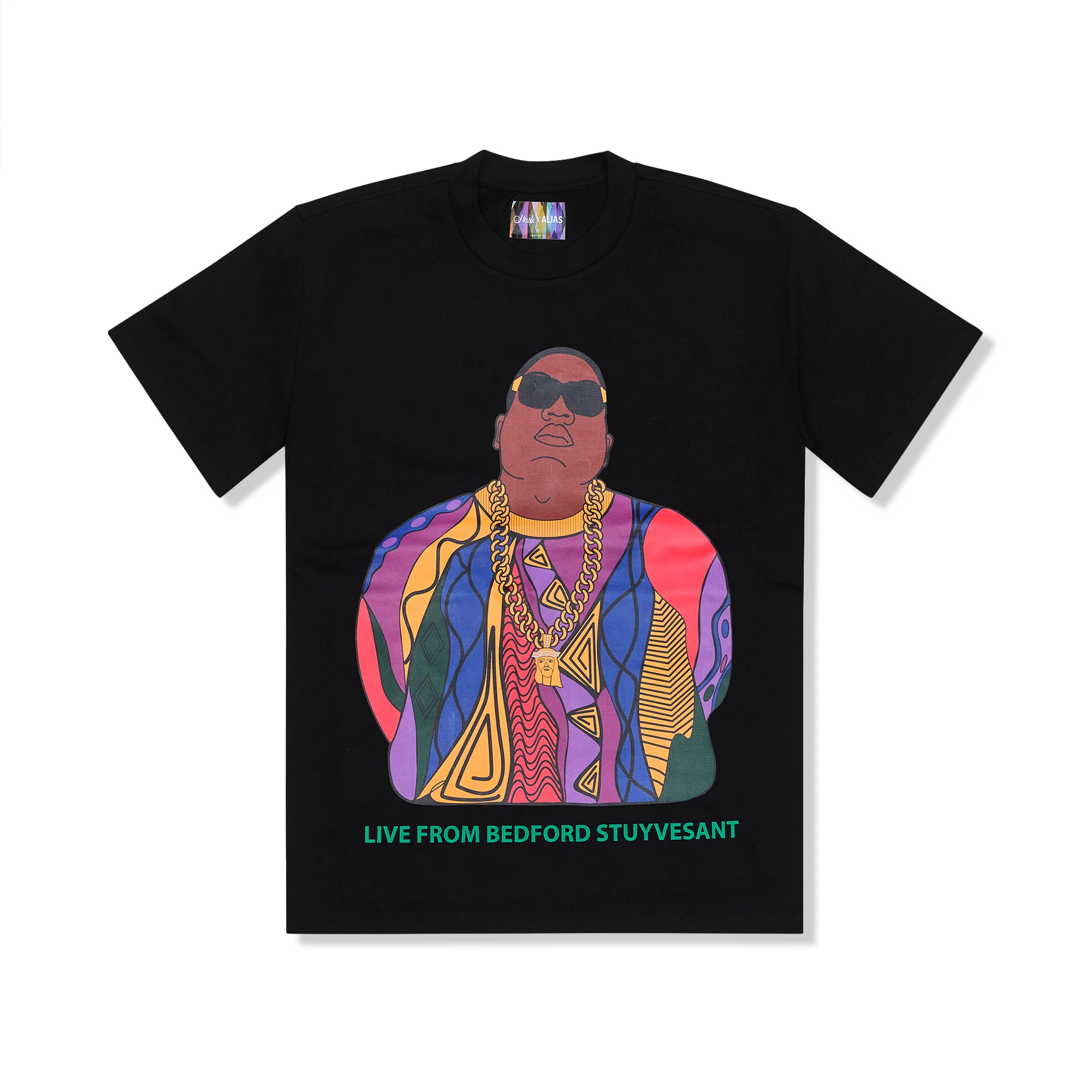 Introducing the Alias x Hush "BIGGIE" Unbelievable T-Shirt, a stylish homage to the legendary The Notorious B.I.G. This t-shirt features an artistic rendition of Biggie wearing a vibrant Coogie sweater, accompanied by the iconic lyrics "Live from Bedford Stuyvesant" from his song "Unbelievable." Available in both white and black, the design is bold and colorful, capturing Biggie's larger-than-life persona. The back of the t-shirt showcases the collaboration logo in soft pink, adding a touch of elegance to the overall design. Made from high-quality cotton, this t-shirt offers comfort and durability with a classic crew neck and relaxed fit, perfect for everyday wear. Embrace the fusion of hip-hop culture and contemporary fashion with the Alias x Hush "BIGGIE" Unbelievable T-Shirt, a must-have for fans of The Notorious B.I.G. and those who appreciate unique and eye-catching designs.