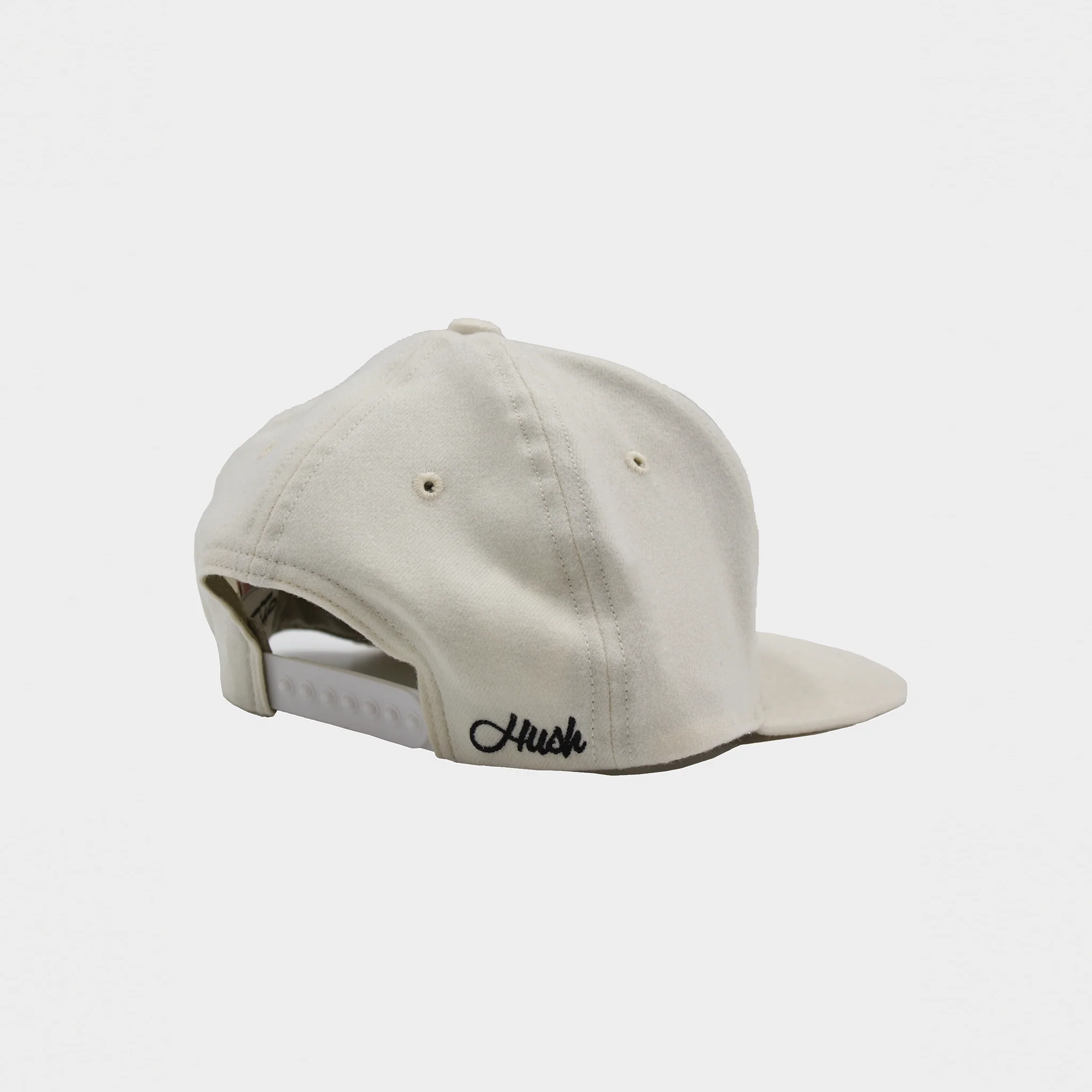 - Embroidered stacked “HUSH” at crown